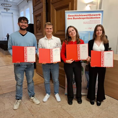 „Bis hierhin und nicht weiter!? Grenzen in der Geschichte“ lautete das Thema der 29. Ausschreibung des Geschichtswettbewerbs des Bundespräsidenten. Mit diesem Thema beschäftigten sich auch drei Gruppen der BOS Miesbach ausführlich. Einer davon, bestehend aus Maria Bernlochner, Sebastian Neudecker und Michael Tretter (alle BOS13) sowie Helene Zehendmaier (ehemals BOS12) gelang dabei ein ganz besonderer Erfolg: Sie worden mit ihrem Podcast zum Thema "Die Grenzen des Sagbaren" zu Landessiegern erkoren. Am 14. Oktober waren sie daher in den Bayerischen Landtag eingeladen, wo ihnen im Rahmen einer Feier im Beisein von Kultusministerin Anna Stolz und Landtagsvizepräsident Tobias Reiß eine Urkunde überreicht wurde - ihr Preisgeld von 500 € hatten sie bereits erhalten.