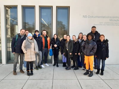 Am 1. März führte eine historische Exkursion die Vorklasse und die BOS12 zum Königsplatz in München. Nachdem wir uns kurz mit dem Platz und seiner Geschichte vertraut gemacht haben, begaben wir uns zu einer Führung ins angrenzende NS-Dokuzentrum, um mehr über Ausgrenzung und Verfolgung im „Dritten Reich“ zu erfahren. Mit dem Aufzug ging es zunächst in den vierten Stock und von dort arbeiteten wir uns der Chronologie der Ausstellung folgend nach unten. Unsere sehr nette und kompetente Referentin erklärte uns anschaulich anhand erschütternder Einzelschicksale wie dem des jüdischen Anwalts Michael Siegel oder des sintistämmigen Boxers Jakob Bamberger, wie groß das Leid vieler Menschen unter der nationalsozialistischen Diktatur war. Auch unsere eigenen Fragen wurden stets kundig und ausführlich beantwortet. Tief beeindruckt hatten wir im Anschluss noch die Möglichkeit, das restliche Dokumentationszentrum eigenständig zu erkunden.