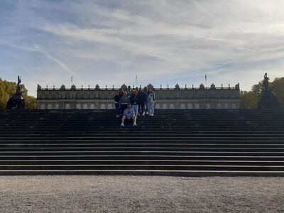 Danach ging es für ein gemeinsames Erinnerungsbild nach draußen in den eindrucksvollen Schlosspark. Dieser kam an diesem Tag durch einen strahlend blauen Himmel besonders gut zur Geltung. Anschließend besuchten die beiden Klassen die Ausstellung im ehemaligen Augustiner Chorherrenstift, zum Verfassungskonvent. Durch interaktive Angebote zu Grundlagen und Werte unserer Demokratie wurden Aspekte vertieft und zum Nachsinnen angeregt.